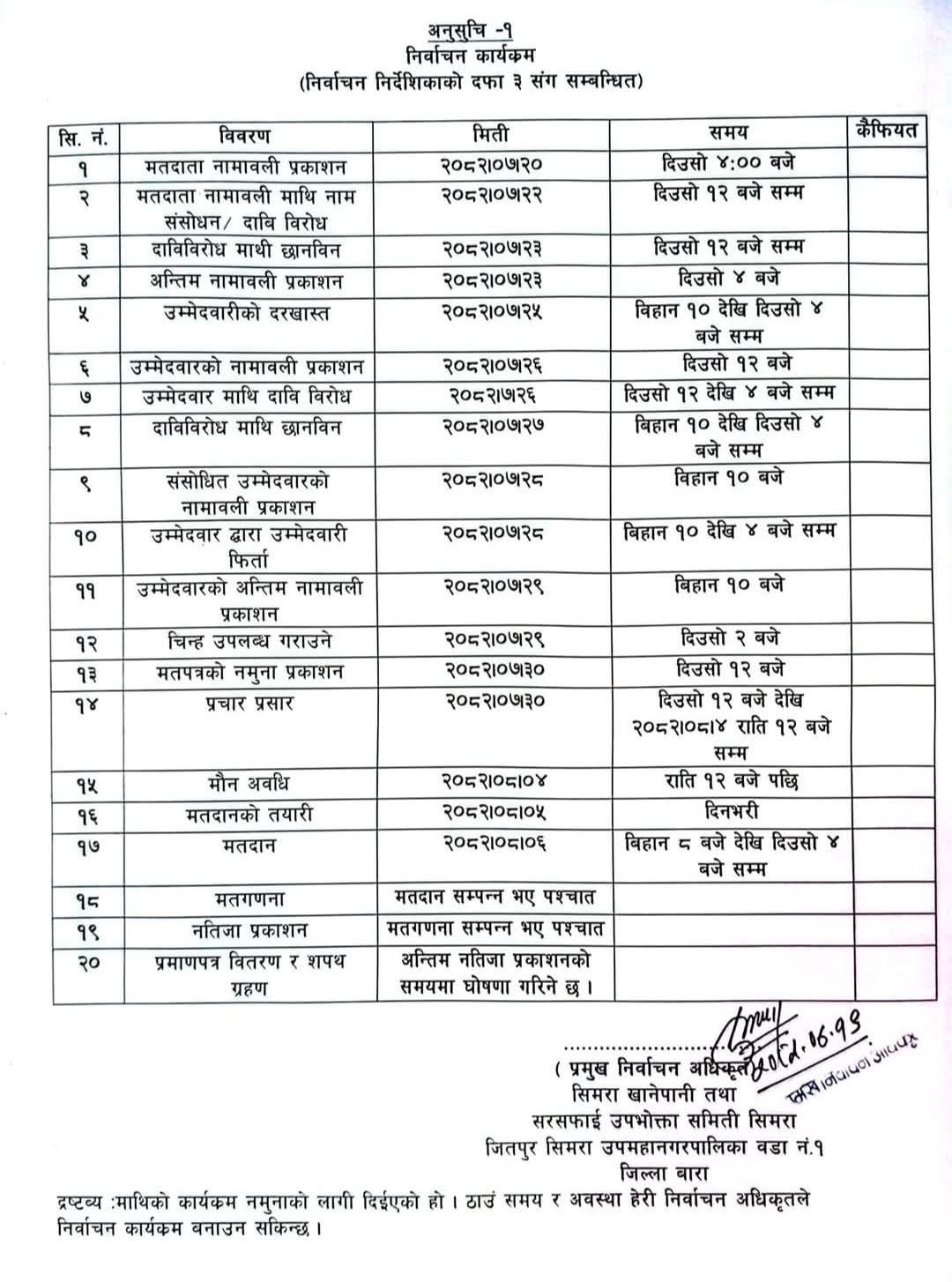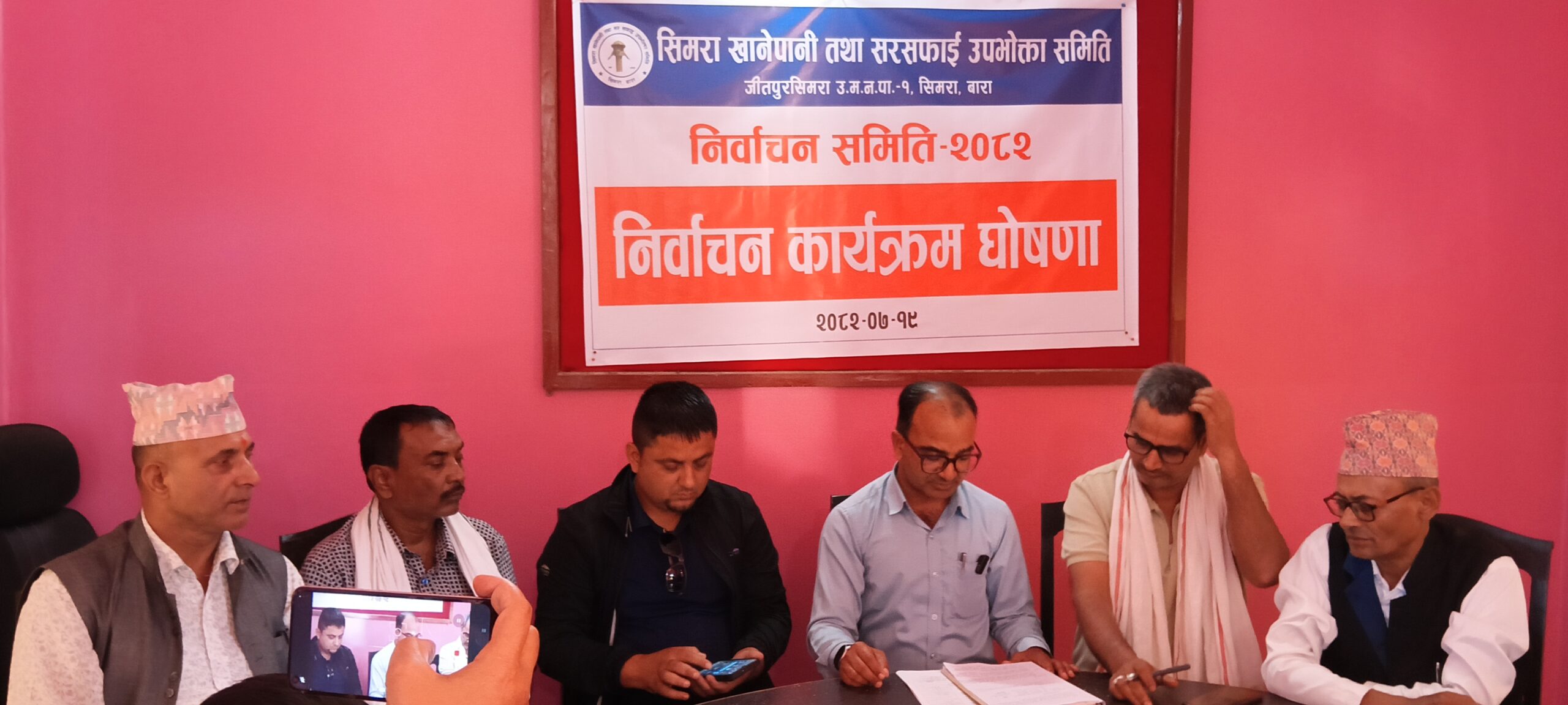 सिमरा,१९ कात्तिकः सिमरा खानेपानी तथा सरसफाइ उपभोक्ता समिति बाराको नयाँ नेतृत्व चयनका लागि निर्वाचन कार्यतालिका सार्वजनिक भएको छ । समितिको २३ औं वार्षिक साधारण सभाबाट गठन भएको निर्वाचन समितिले बुधबार सिमरास्थित खानेपानीको कार्यालयमा पत्रकार सम्मेलन गरि निर्वाचनका लागि कार्यक्रम सार्वजनिक गरेको हो ।