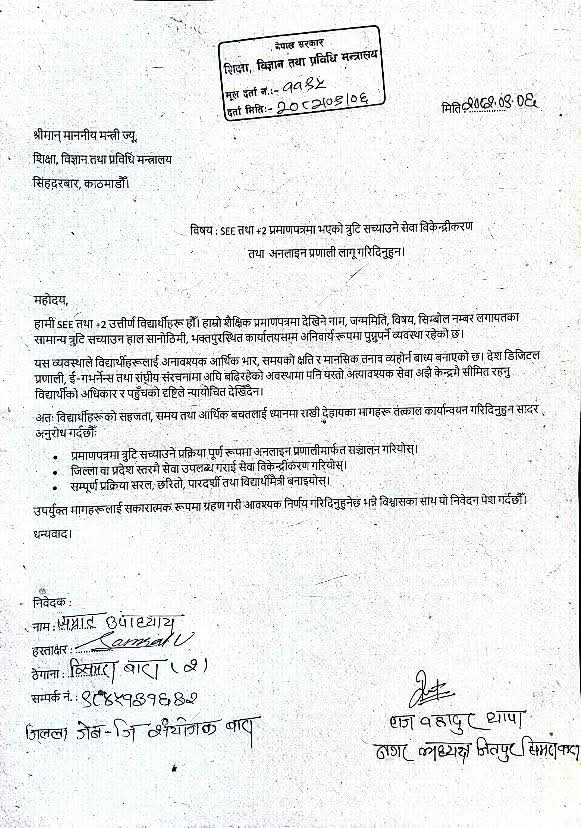 सिमरा,६ पुसः प्रमाणपत्रमा देखिएको त्रुटि सच्याउने सेवा विकेन्द्रीकरण र अनलाइन प्रणाली लागू गर्न माग गर्दै जेन्जी युवा बाराले शिक्षा विज्ञान तथा प्रविधि मन्त्रालयमा तीन बुँदे ज्ञापन पत्र बुझाएको छ । आइतबार शिक्षा मन्त्री महावीर पुनलाई भेटी सी(एसइइ) परीक्षा र कक्षा १२ को प्रमाणपत्रमा भएको त्रुटि सच्याउने सेवा विकेन्द्रीकरण तथा अनलाइन प्रणाली लागु गरिदिन मागसहित आग्रह गर्दै जेन्जी युवा बाराले मागसहित ज्ञापन पत्र बुझाएको हो ।